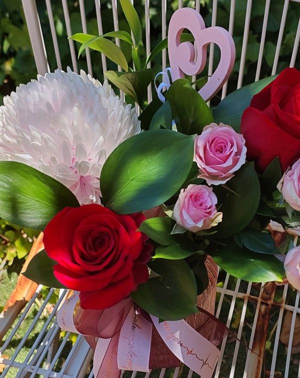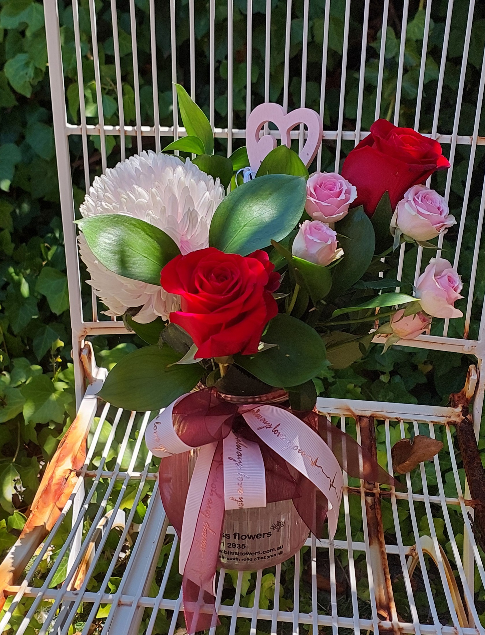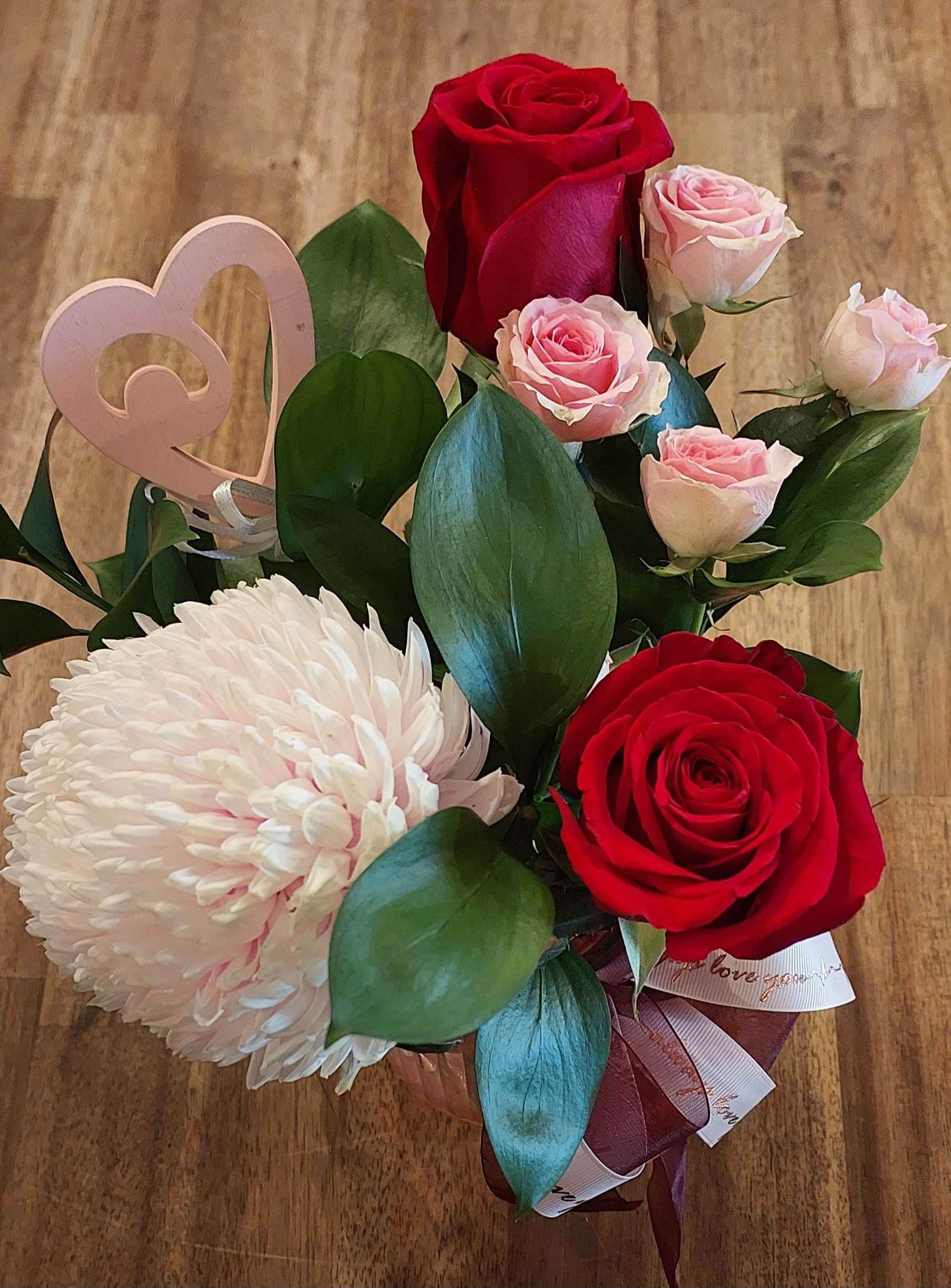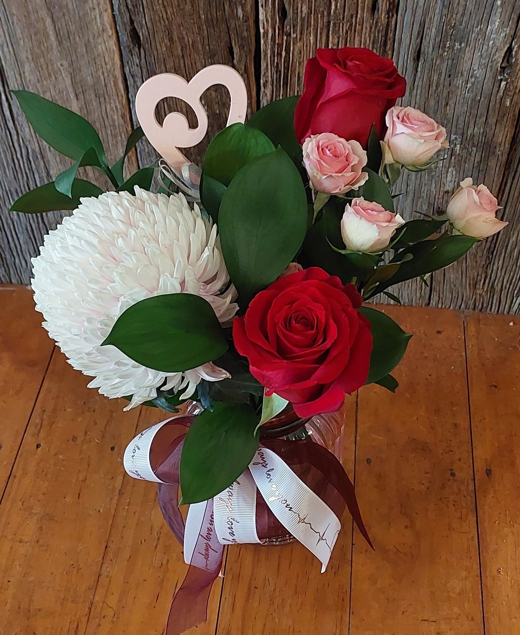 Roses, chrysanthemums, greenery and a sweet wooden heart keepsake – presented in a petite glass vase.
