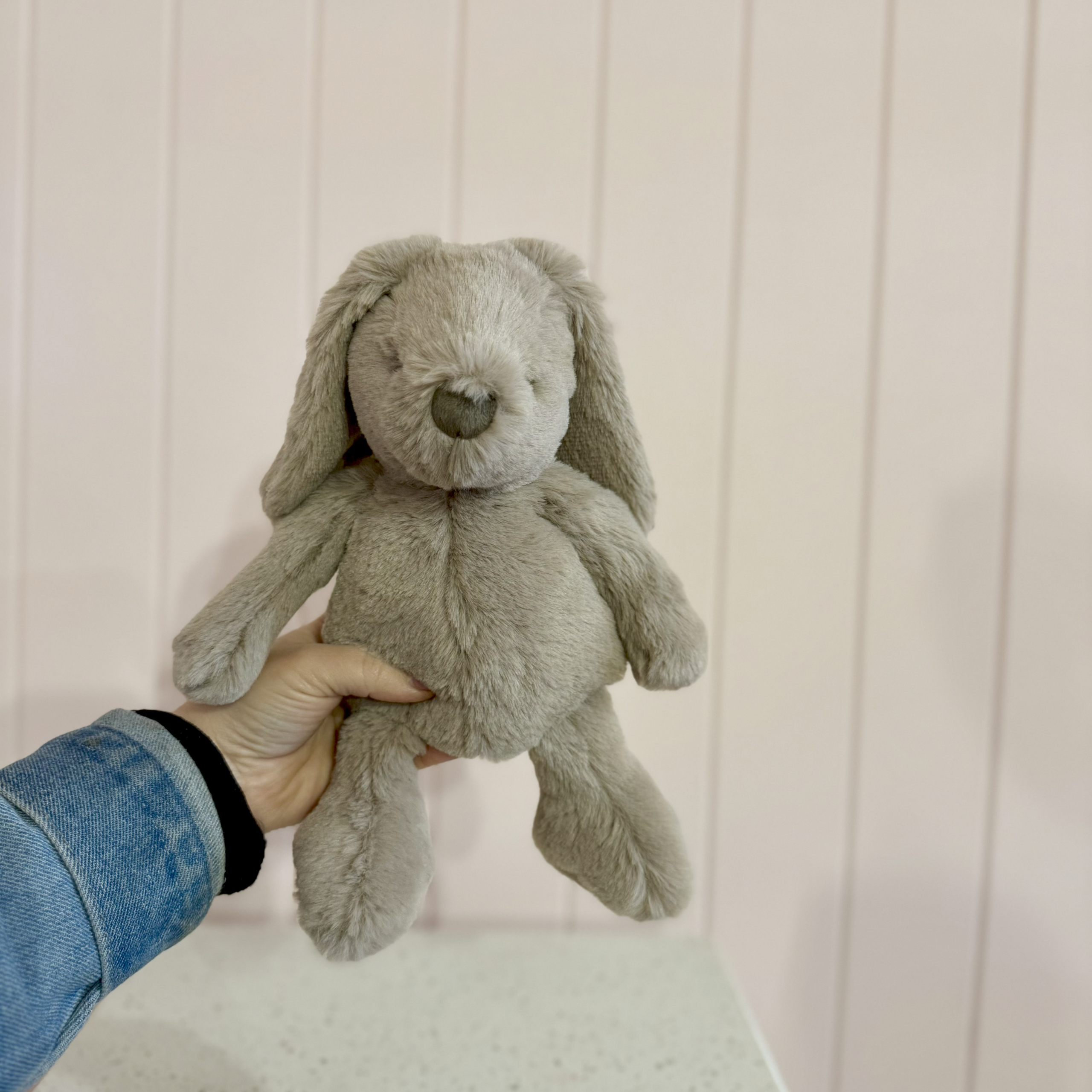 With soft brown/blue, floppy ears, and a weighted beanie bottom, this pastel bunny sits upright on shelves and is perfectly sized for little hands to hold. The sweetest cuddliest gift for a new baby!