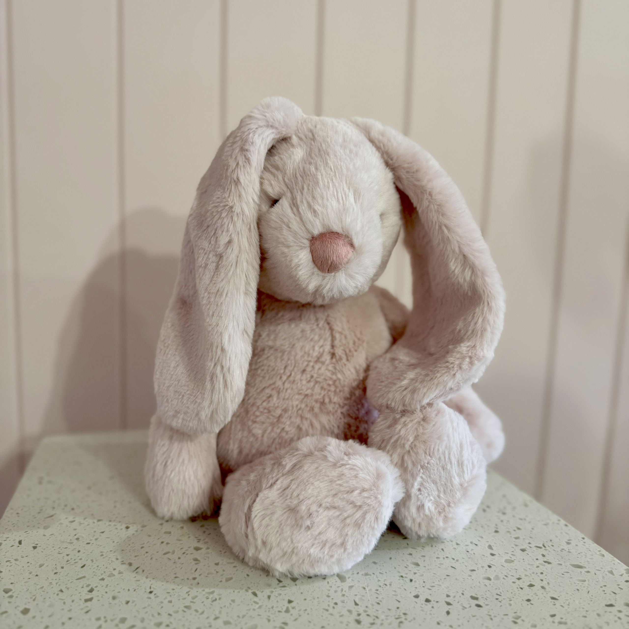 With soft, lemon-yellow/pink/mint fur, floppy ears, and a weighted beanie bottom, this pastel bunny sits upright on shelves and is perfectly sized for little hands to hold. The sweetest cuddliest gift for a new baby!