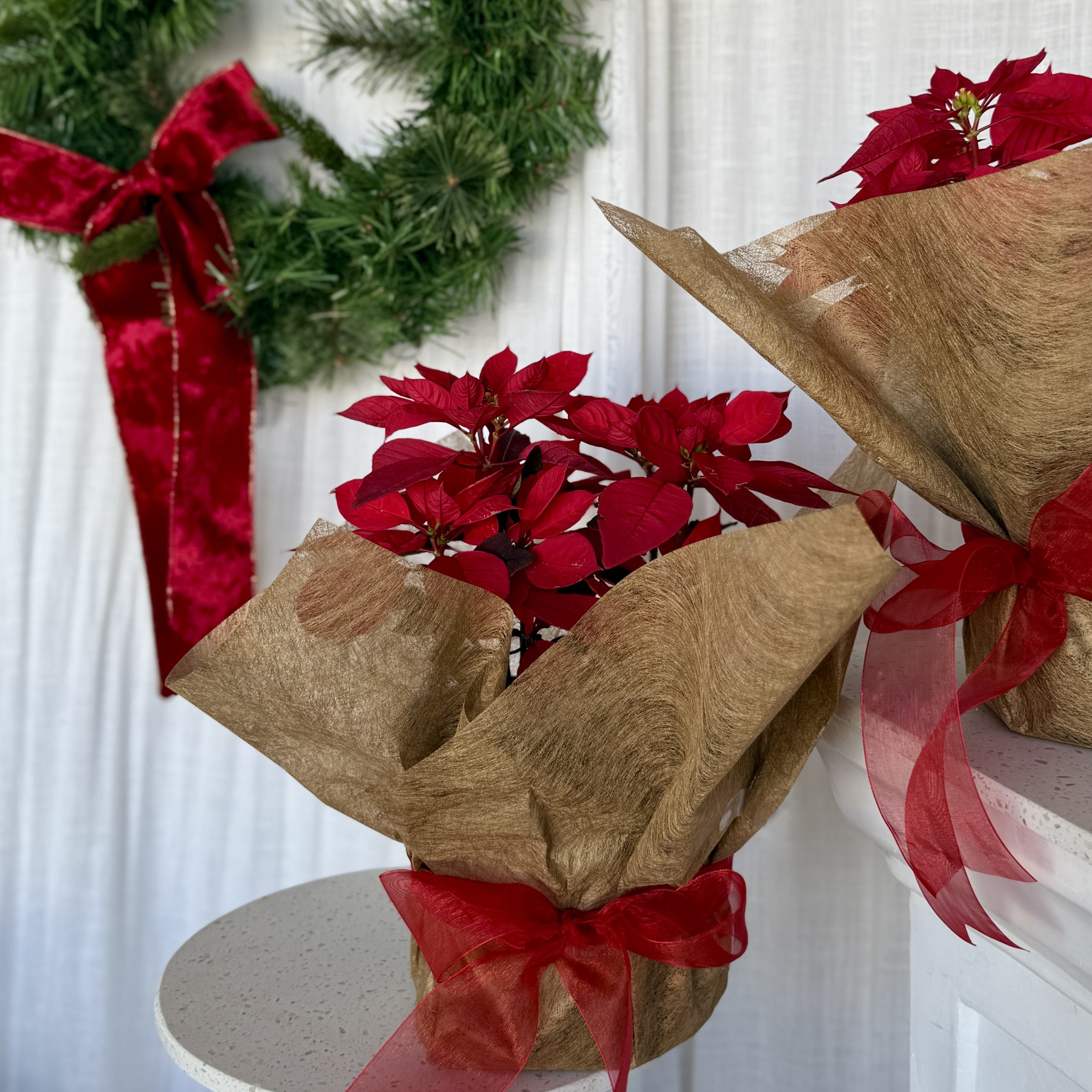 Poinsettias are a popular choice when it comes to decorating the table for Christmas or for gift giving during the festive season. The plant will be gift wrapped and complimented with a large bow!